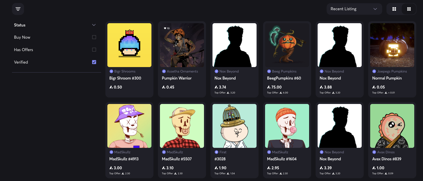 * Recent Listings: Individual NFTs that have been recently put up for\