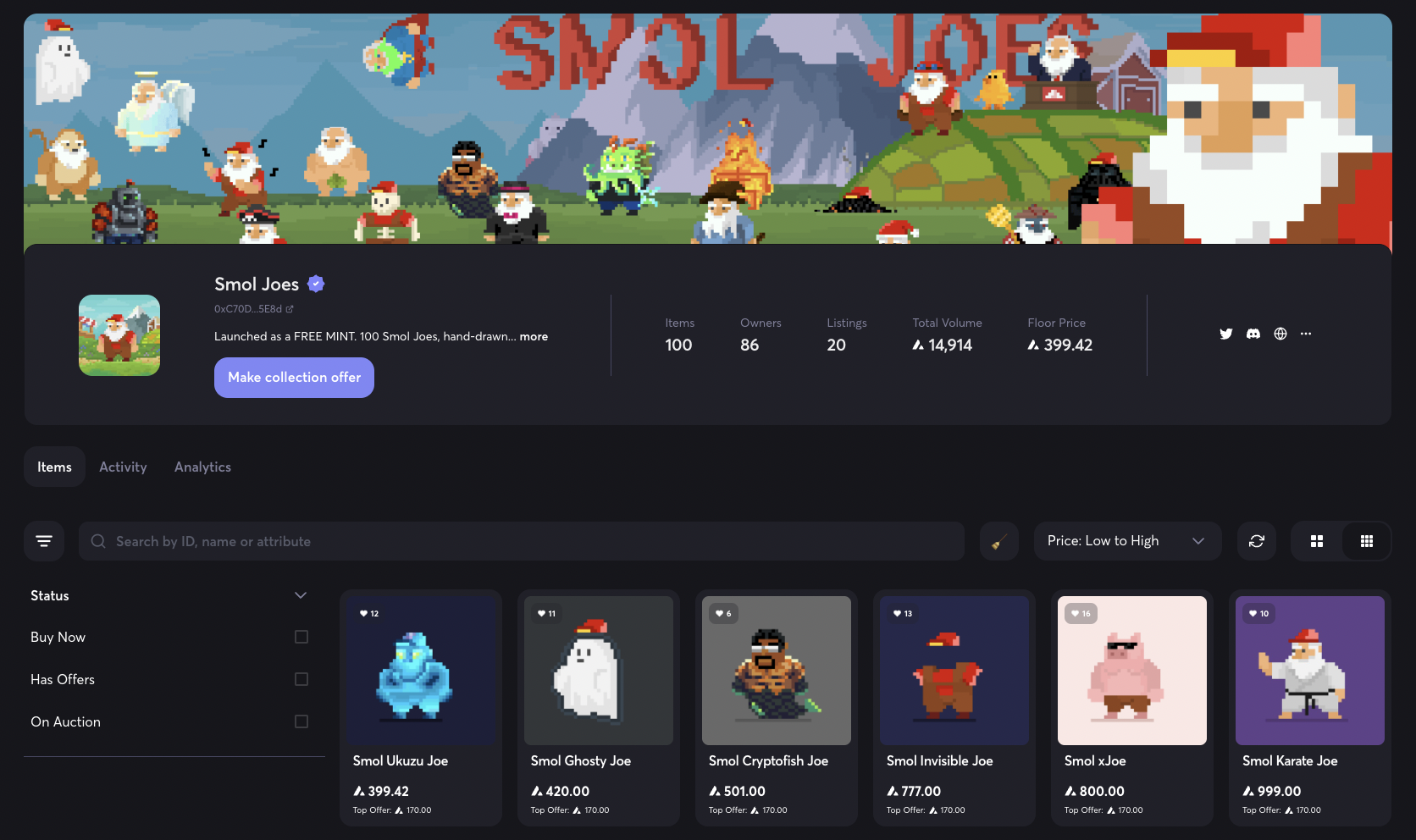 In the panel below the collection banner, you can find information regarding collection size, volume and price.