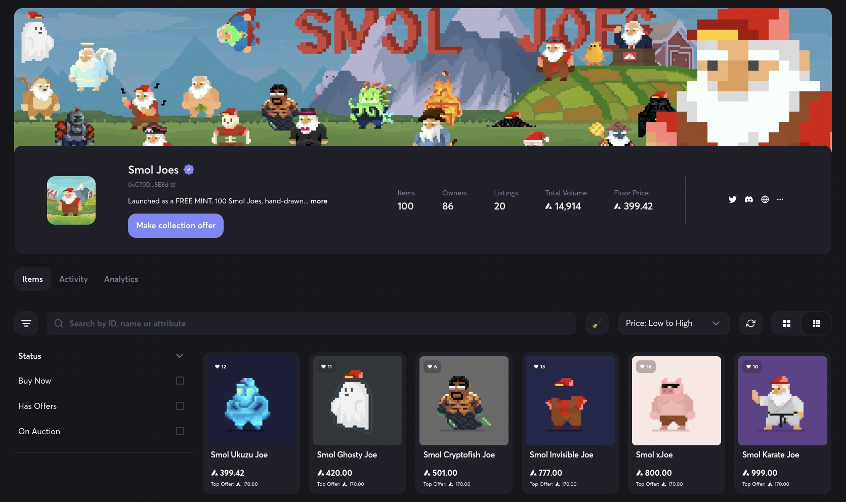 The Status Filter allows you to explore the collection, identifying NFTs that you can 'Buy Now' or 'Has Offers'.