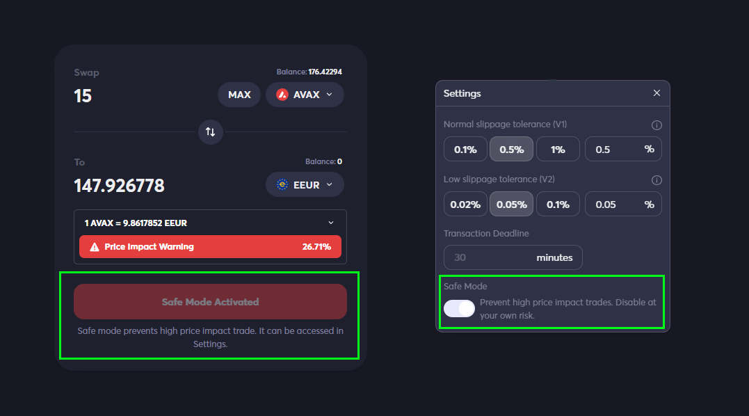 * If your Trade causes a price impact that is over 5% you will not be able to execute the Swap unless you turn off 'Safe Mode'. Turn off Safe Mode by clicking on the Settings button and then toggling off 'Safe Mode'.