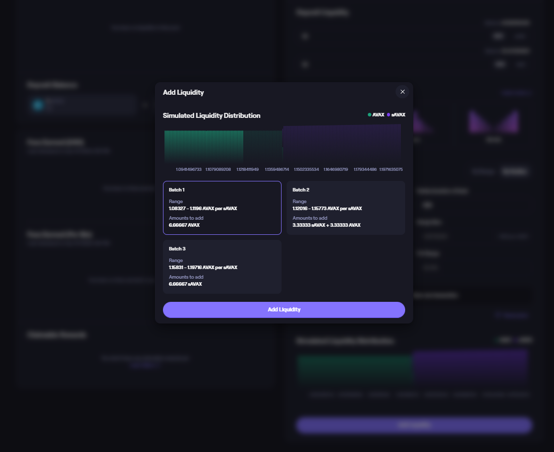 Deploy Liquidity over ANY range you desire, select your liquidity shape and enter the price range that you want to deploy Liquidity over. Next, select 'Add Liquidity' for each Batch transaction to deploy your Liquidity over the desired range. Using Batch Liquidity Deployment, you can deploy liquidity over a wide range, enabling a more passive approach to Liquidity Provisioning.