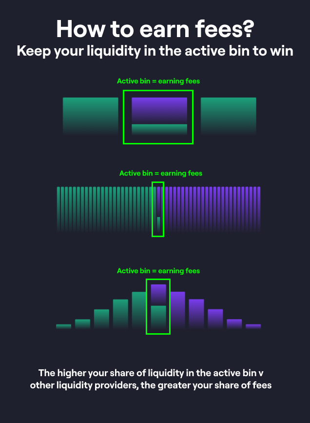 The active bin is the currently live 'market price' of the assets in a Liquidity Pool. Only the active bin consists of both tokens and only the active bin earns trading fees. Therefore when providing liquidity, it is important to always have Liquidity inside the active bin to ensure trading fees are being accrued. Once the price moves to a different bin, the previous active bin becomes inactive and stops acquiring fees.