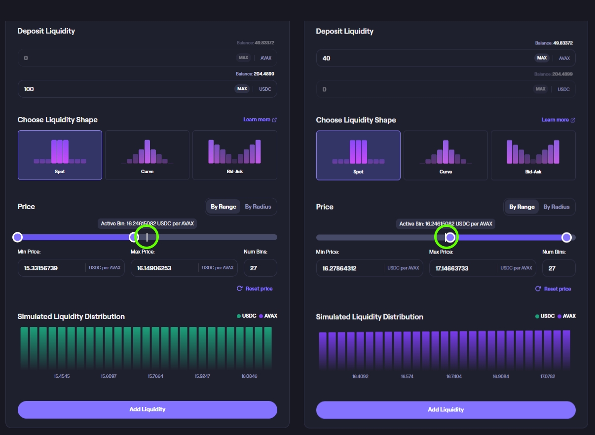 Use the sliders to set your desired price range. Position both sliders to the left or the right of the 'Active Bin' to focus your liquidity on one side of the market.
