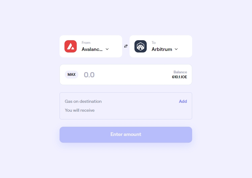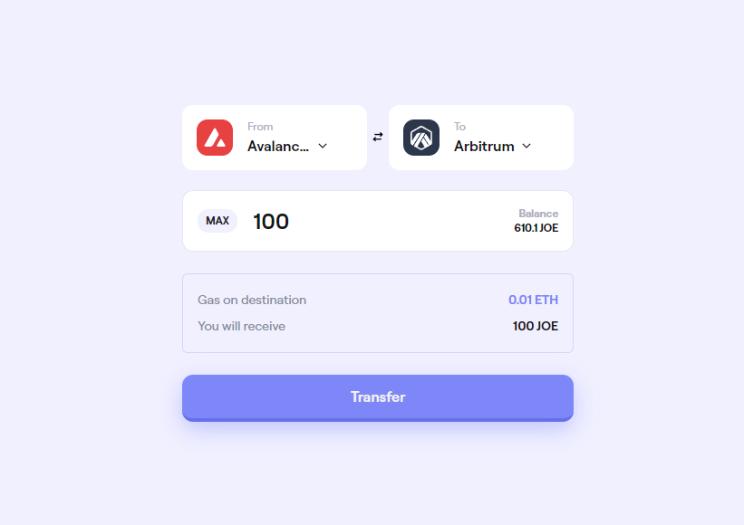 Select the destination chain (e.g., Ethereum, Binance Smart Chain) to which you want to bridge your JOE tokens. In the below image example JOE is being transferred from Avalanche to Arbitrum.