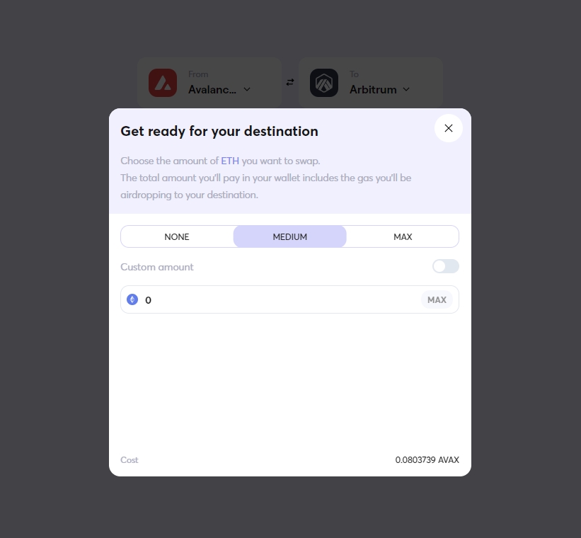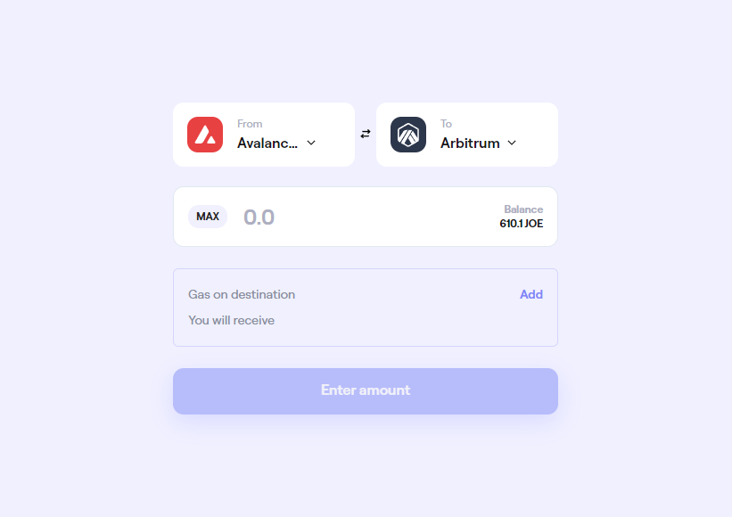 If you are transferring to a new blockchain you have not yet been on, you will need the native blockchain network gas token. In the case of Arbitrum, you'll need some ETH. You can do that while transfering your JOE tokens, using LayerZeros infrastructure to facilitate a swap for you that gives you some gas when your JOE tokens arrive.