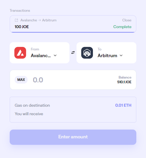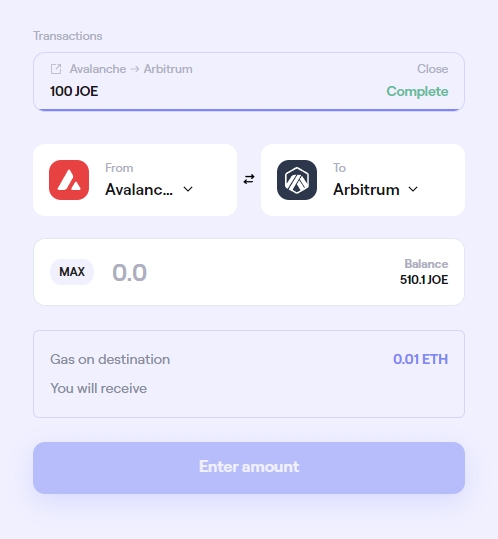 Once the transfer is complete, check your wallet on the destination chain to confirm receipt of your bridged JOE tokens. the UI will provide you with a transaction link, enabling you to check the blockchain explorer for verifiable confirmation of its completion.